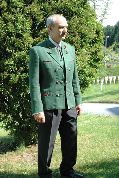 Rock: rot unterlegte Taschen; Gams am Rücken; Hirschhornknöpfe und Rehkronen
