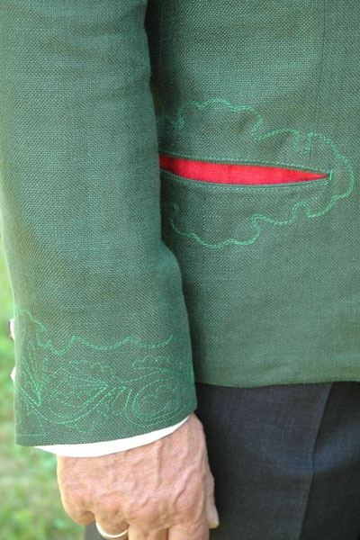 Rock: rot unterlegte Taschen; Gams am Rücken; Hirschhornknöpfe und Rehkronen