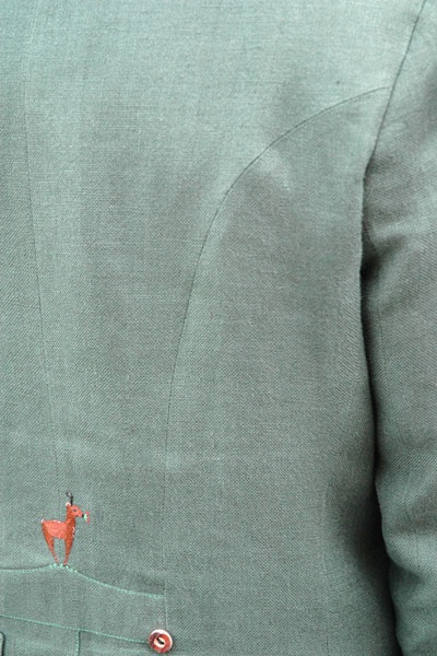 Rock: rot unterlegte Taschen; Gams am Rücken; Hirschhornknöpfe und Rehkronen