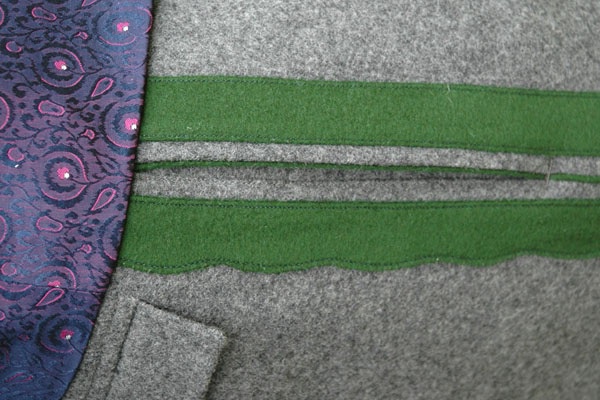 Rock: Breiter Passepoil mit grünem Tuch; Schlußrock (in der Taillie komplett durchgeschnitten); im Rücken Dreieckpatten und Hakenschlitz; Ärmelaufschlag gewellt.