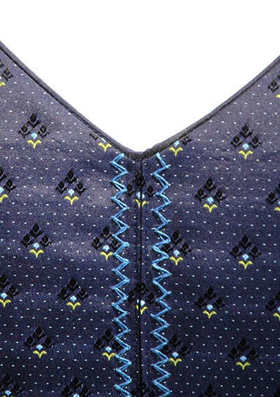 Abgesteppter und bestickter Spiegel am vorderen Halsausschnitt (5-7,5 cm breit); rückwärtige Kellernaht bestickt
