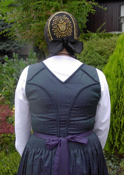 Rüschen am Ausschnitt und Rückenteil, Samtspiegel mit Perlenstickerei.