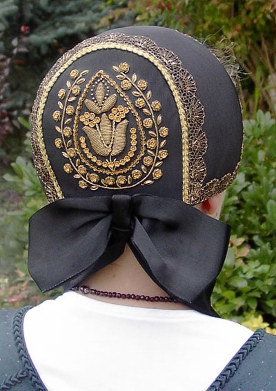 Rüschen am Ausschnitt und Rückenteil, Samtspiegel mit Perlenstickerei.