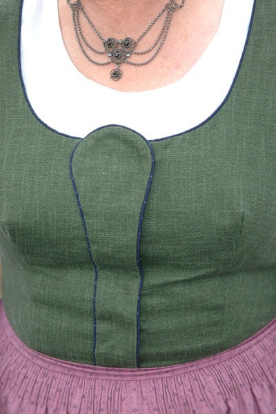 Rund ausgeformter Latz. Ist dem Rad im Wappen nachempfunden. Latz, Ausschnitt und hintere Teilungsnähte werden mit dem Kittel- oder Schürzenstoff passepoiliert.