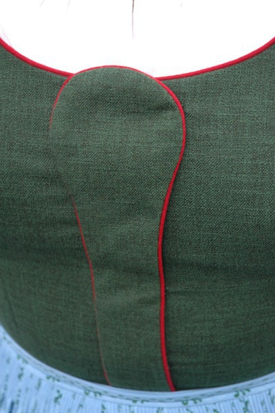 Rund ausgeformter Latz. Ist dem Rad im Wappen nachempfunden. Latz, Ausschnitt und hintere Teilungsnähte werden mit dem Kittel- oder Schürzenstoff passepoiliert.