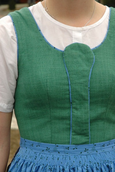 Rund ausgeformter Latz. Ist dem Rad im Wappen nachempfunden. Latz, Ausschnitt und hintere Teilungsnähte werden mit dem Kittel- oder Schürzenstoff passepoiliert.