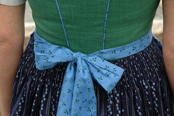 Rund ausgeformter Latz. Ist dem Rad im Wappen nachempfunden. Latz, Ausschnitt und hintere Teilungsnähte werden mit dem Kittel- oder Schürzenstoff passepoiliert.