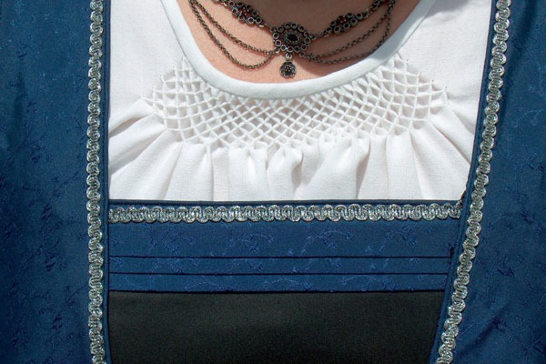 Glatter schwarzer Seidenlatz, welcher an der Oberkante durch 3 Fältchen aus dem Leiblstoff hervorgehoben wird. Die Verschnürung mit Gold- oder Silberschnur (allenfalls auch schwarz) wird über zarte Haken aus Messing oder Silber geführt. Rücken spitzer Ausschnitt. Rückenmitte wird durch eine Kellerhnaht betont. An der vorderen Kante, Ausschnitt,oberen Latzkante und jeweils neben der Absteppkante der Kellernaht wird eine schmale Gold- oder Silberborte aufgenäht. (eventuell Stickerei)
