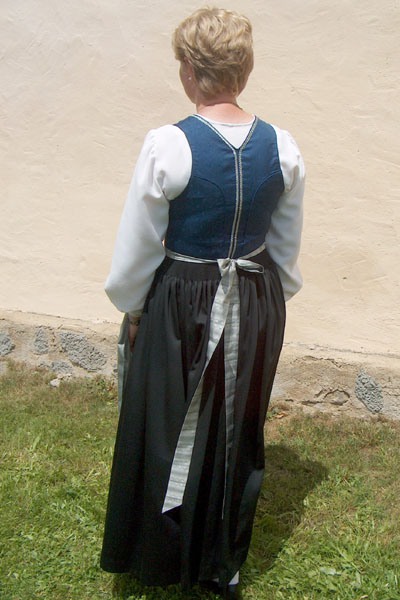 Glatter schwarzer Seidenlatz, welcher an der Oberkante durch 3 Fältchen aus dem Leiblstoff hervorgehoben wird. Die Verschnürung mit Gold- oder Silberschnur (allenfalls auch schwarz) wird über zarte Haken aus Messing oder Silber geführt. Rücken spitzer Ausschnitt. Rückenmitte wird durch eine Kellerhnaht betont. An der vorderen Kante, Ausschnitt,oberen Latzkante und jeweils neben der Absteppkante der Kellernaht wird eine schmale Gold- oder Silberborte aufgenäht. (eventuell Stickerei)