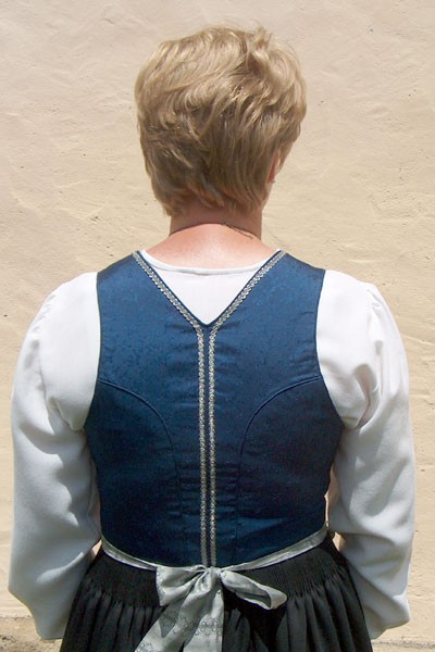Glatter schwarzer Seidenlatz, welcher an der Oberkante durch 3 Fältchen aus dem Leiblstoff hervorgehoben wird. Die Verschnürung mit Gold- oder Silberschnur (allenfalls auch schwarz) wird über zarte Haken aus Messing oder Silber geführt. Rücken spitzer Ausschnitt. Rückenmitte wird durch eine Kellerhnaht betont. An der vorderen Kante, Ausschnitt,oberen Latzkante und jeweils neben der Absteppkante der Kellernaht wird eine schmale Gold- oder Silberborte aufgenäht. (eventuell Stickerei)
