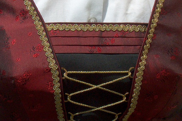 Glatter schwarzer Seidenlatz, welcher an der Oberkante durch 3 Fältchen aus dem Leiblstoff hervorgehoben wird. Die Verschnürung mit Gold- oder Silberschnur (allenfalls auch schwarz) wird über zarte Haken aus Messing oder Silber geführt. Rücken spitzer Ausschnitt. Rückenmitte wird durch eine Kellerhnaht betont. An der vorderen Kante, Ausschnitt,oberen Latzkante und jeweils neben der Absteppkante der Kellernaht wird eine schmale Gold- oder Silberborte aufgenäht. (eventuell Stickerei)