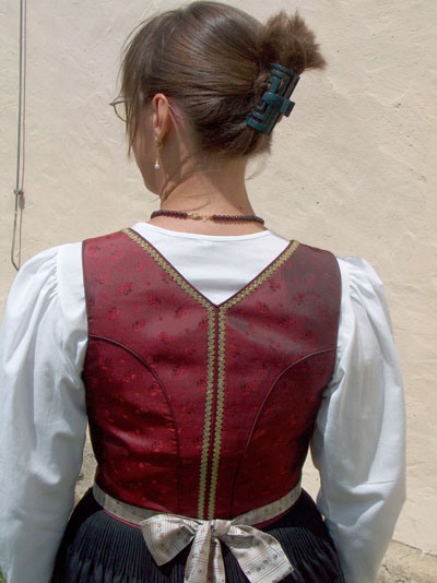 Glatter schwarzer Seidenlatz, welcher an der Oberkante durch 3 Fältchen aus dem Leiblstoff hervorgehoben wird. Die Verschnürung mit Gold- oder Silberschnur (allenfalls auch schwarz) wird über zarte Haken aus Messing oder Silber geführt. Rücken spitzer Ausschnitt. Rückenmitte wird durch eine Kellerhnaht betont. An der vorderen Kante, Ausschnitt,oberen Latzkante und jeweils neben der Absteppkante der Kellernaht wird eine schmale Gold- oder Silberborte aufgenäht. (eventuell Stickerei)