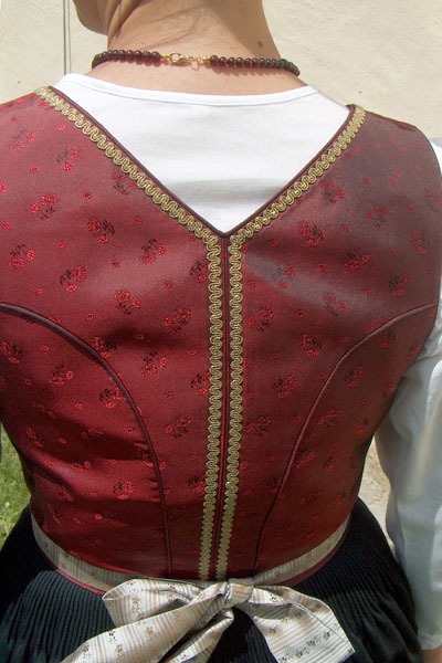 Glatter schwarzer Seidenlatz, welcher an der Oberkante durch 3 Fältchen aus dem Leiblstoff hervorgehoben wird. Die Verschnürung mit Gold- oder Silberschnur (allenfalls auch schwarz) wird über zarte Haken aus Messing oder Silber geführt. Rücken spitzer Ausschnitt. Rückenmitte wird durch eine Kellerhnaht betont. An der vorderen Kante, Ausschnitt,oberen Latzkante und jeweils neben der Absteppkante der Kellernaht wird eine schmale Gold- oder Silberborte aufgenäht. (eventuell Stickerei)