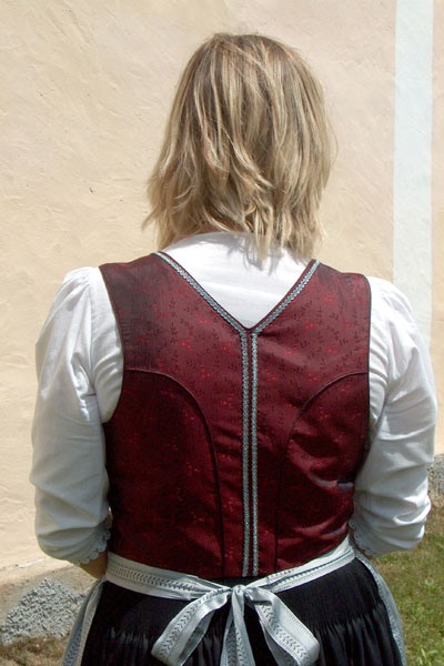 Glatter schwarzer Seidenlatz, welcher an der Oberkante durch 3 Fältchen aus dem Leiblstoff hervorgehoben wird. Die Verschnürung mit Gold- oder Silberschnur (allenfalls auch schwarz) wird über zarte Haken aus Messing oder Silber geführt. Rücken spitzer Ausschnitt. Rückenmitte wird durch eine Kellerhnaht betont. An der vorderen Kante, Ausschnitt,oberen Latzkante und jeweils neben der Absteppkante der Kellernaht wird eine schmale Gold- oder Silberborte aufgenäht. (eventuell Stickerei)