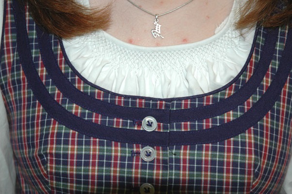 Passepoilierung in rot oder blau im Farbkontrast zum Leib. Passepoilierung mit schwarzem Samtband abgegrenzt.