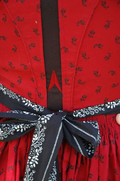 Schmaler (höchstens 3cm breiter) Formbesatz am Halsausschnitt und 2,5 cm breiter Einsatz in der Rückenmitte in schwarz mit zarter Stickerei. Blende am Halsausschnitt mit Leibkittelstoff beidseitig passepoiliert.