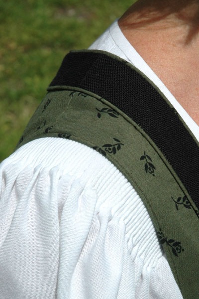 Schmaler (höchstens 3cm breiter) Formbesatz am Halsausschnitt und 2,5 cm breiter Einsatz in der Rückenmitte in schwarz mit zarter Stickerei. Blende am Halsausschnitt mit Leibkittelstoff beidseitig passepoiliert.
