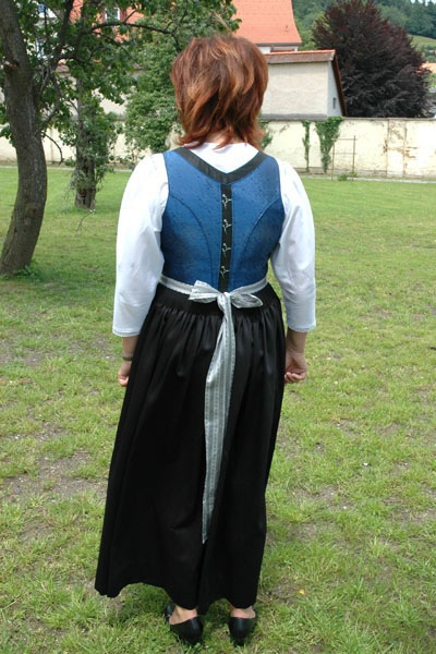 Schmaler (höchstens 3cm breiter) Formbesatz am Halsausschnitt und 2,5 cm breiter Einsatz in der Rückenmitte in schwarz mit zarter Stickerei. Blende am Halsausschnitt mit Leibkittelstoff beidseitig passepoiliert.