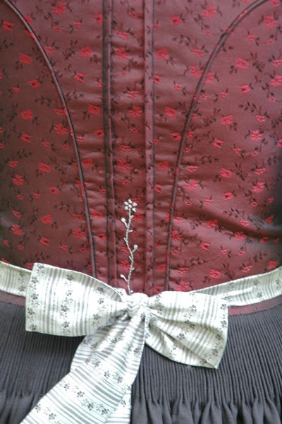 Schmale Formblende (höchstens 2,5 cm) am Halsausschnitt und Einsatz in der Rückenmitte in schwarzer Seide oder in der Farbe des Leibls.