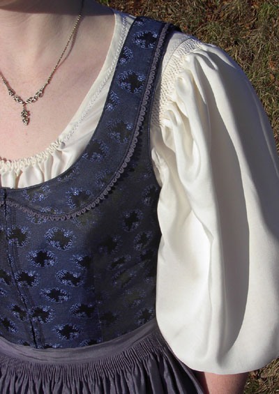 Aufgenähte Kragenblende mit Fältchenodre Rüschenvorstoß in der Schürzenfarbe. Im Rücken allenfalls ein Fächer.