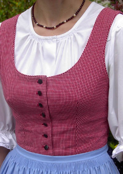 Rüsche aus Kleiderstoff am Ausschnitt und eventuell am Kittel. Am Rücken der „Stainzer Fächer“.