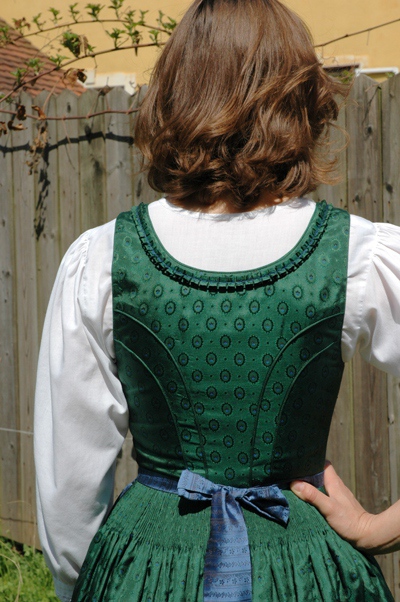 Schmale Faltenrüsche, 1,5 cm breit aus Leibstoff mit Zierstich in der Mitte festgehalten. (Molinegarn, Ton in Ton) 1 cm vom Ausschnitt entfernt. Hals- und Armausschnitt passepoiliert.