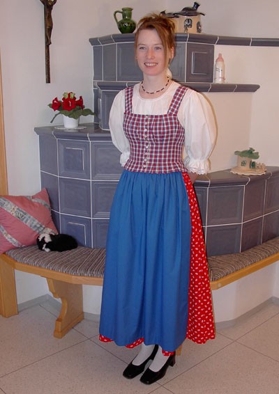 Nach zwei verschiedenen Musterstücken aus der Gegend von Turnau, wobei das Miederleibchen an die Außenseite des Kittels genäht war, wurde diese Alltagstracht erneuert.