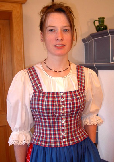 Nach zwei verschiedenen Musterstücken aus der Gegend von Turnau, wobei das Miederleibchen an die Außenseite des Kittels genäht war, wurde diese Alltagstracht erneuert.